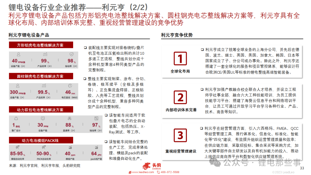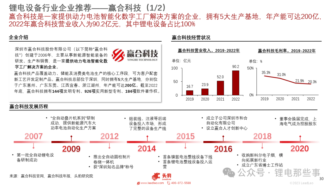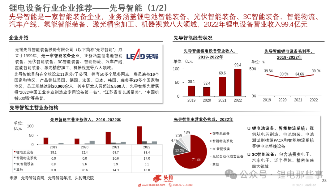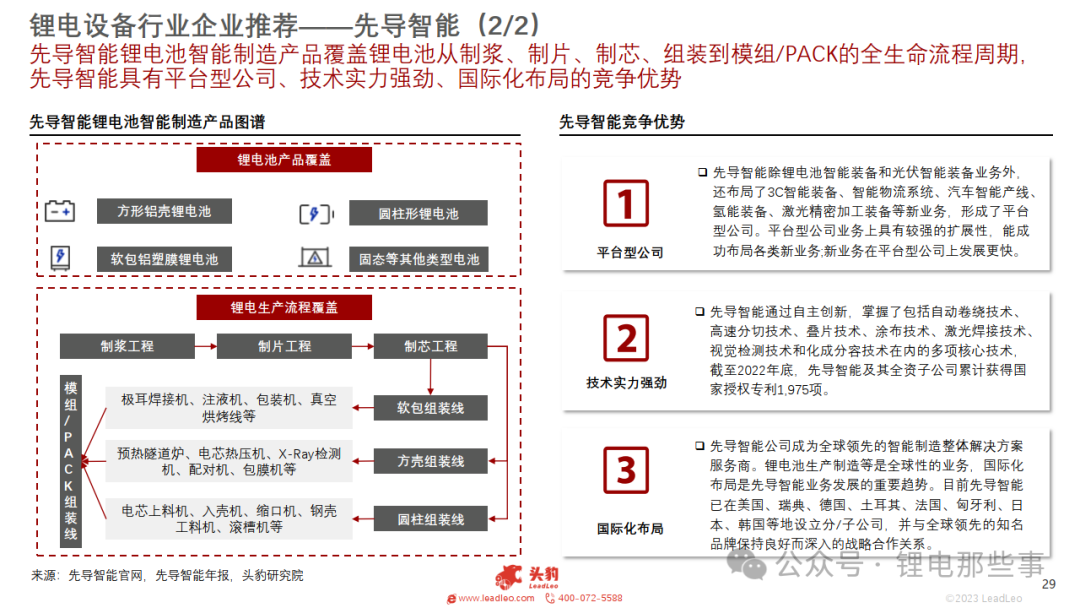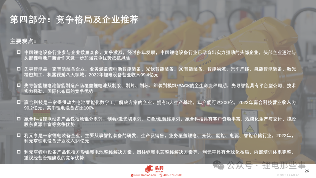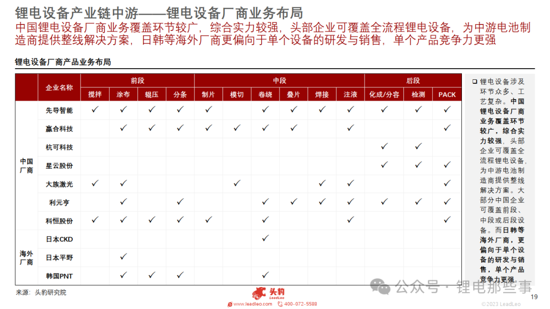 从锂电设备的价值占比来看,锂电设备工艺流程中,前段、中段、后段设备分别占比30%、40%、30%。其中,前段设备中的核心设备为涂布机,中段为卷绕/叠片机,后段为化成/分容检测机。前段、中段设备价值占比较大,但技术要求相对更高,市场竞争格局较为清晰,先导智能、赢合科技作为代表厂商地位稳固。后段设备进入门槛相对较低,市场参与者众多,虽然价值占比仅30%,但竞争激烈,市场竞争格局尚未明朗。