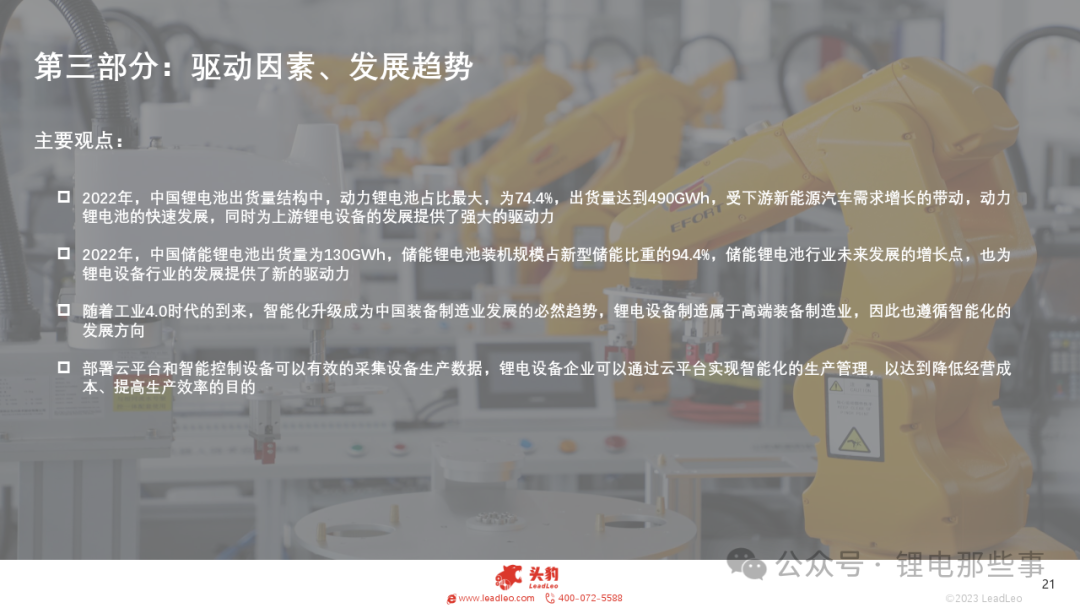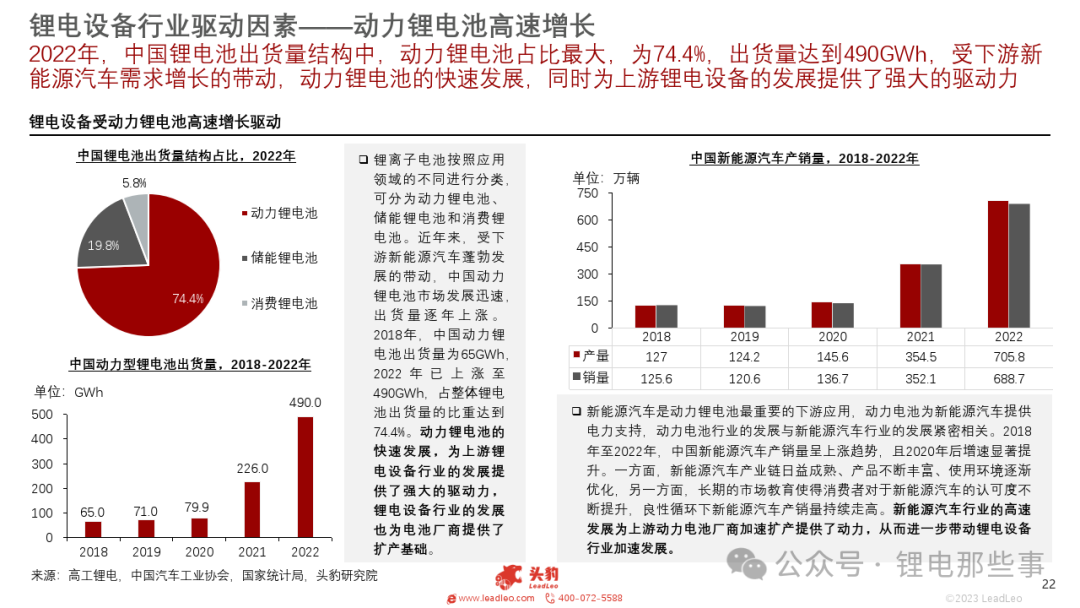 该阶段锂电设备市场加速整合,行业内一批实力相对较弱的企业出现了产能停滞甚至退出市场,市场份额进一步向优质的头部企业集中。锂电池出货结构中,动力电池领域需求增长较为明显。