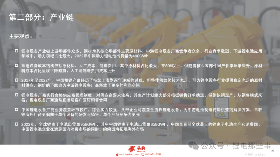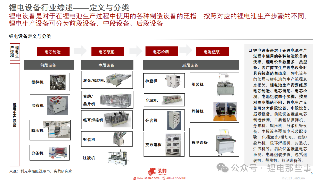 锂电设备是对于在锂电池生产过程中使用的各种制造设备的泛指,按照对应的锂电池生产步骤的不同,锂电生产设备可分为前段设备、中段设备、后段设备。