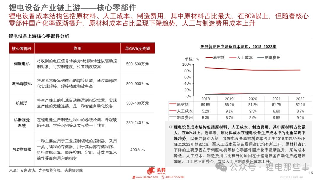 中国锂电设备行业在发展初期由国外垄断,设备严重依赖进口。随着技术进步以及下游应用领域的快速发展,中国锂电设备国产化率显著提高。截至2023年4月,锂电设备国产化率也已经达到90%以上,其中关键工序的装备国产化率达到80%以上。涂布设备、卷绕设备作为前段及中段设备中的核心设备,国产化率在98%左右,模切设备国产化率在95%,组装设备、检测设备、叠片设备属于后段设备,国产化率在90%左右。目前锂电设备中,仅部分高精尖零部件仍需进口,例如涂布机的高精度磨头、高功率激光焊接机的接口等,对设备精度要求较高。