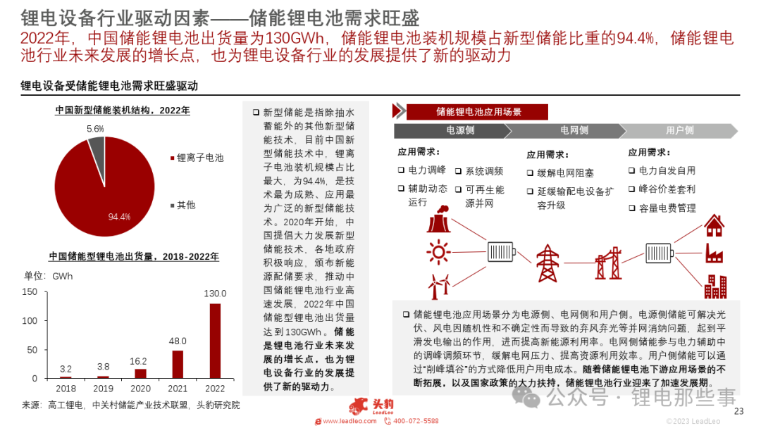 2018年至2020年,受下游新能源汽车高速发展的带动,中国动力锂电池出货量持续上涨,逐渐发展成为锂电池出货结构中占比最大的类型。动力电池的高速发展驱动锂电池企业纷纷扩产,锂电生产设备需求量随之上涨,带动锂电设备市场规模上涨。2020年后,动力电池产能过剩现象开始显现,储能领域成为锂电池需求量新的增长点,带动锂电设备市场规模增长。