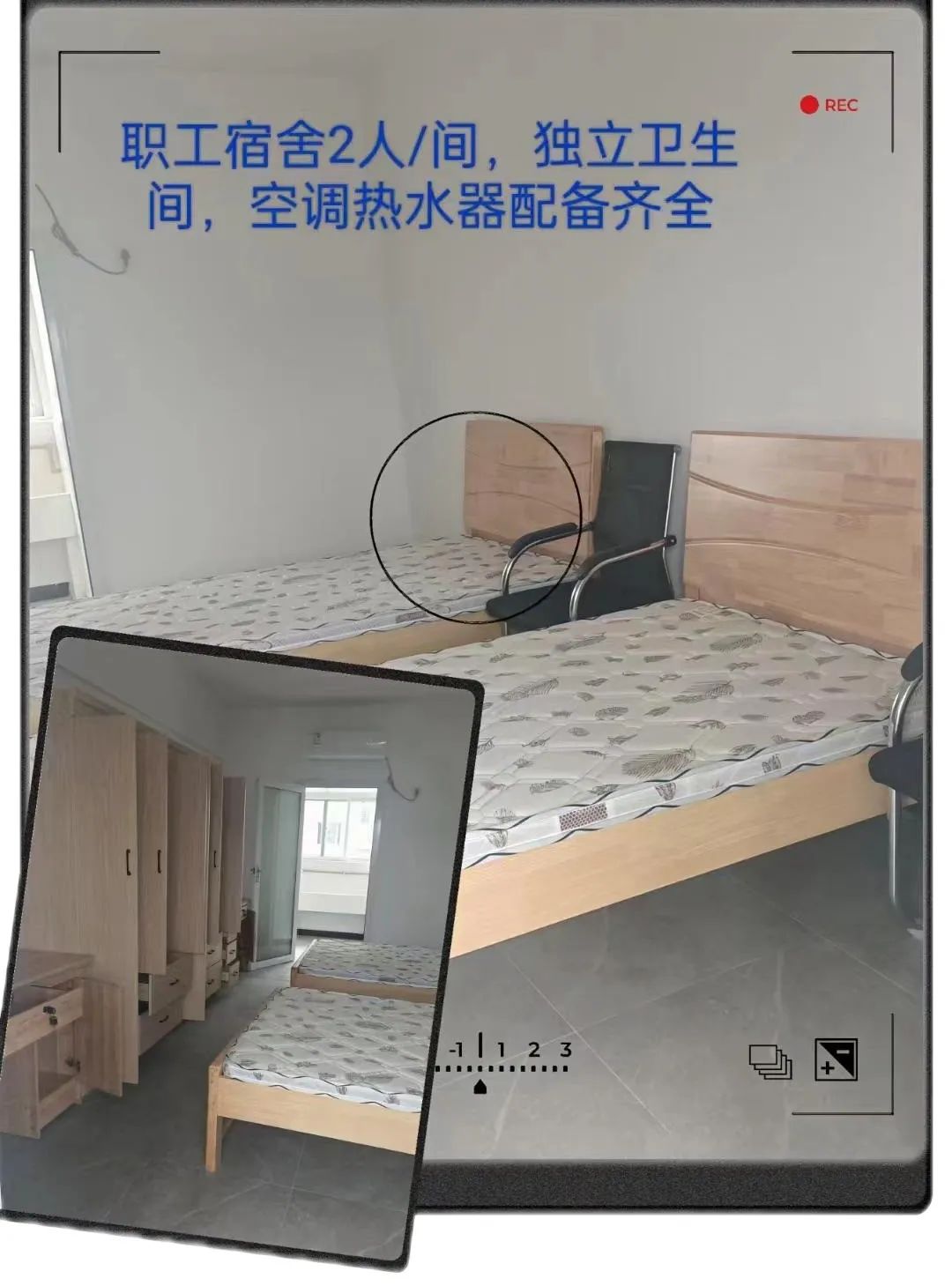 提供食宿:职工食堂提供健康营养餐,宿舍安排2人/间,夫妻职工提供夫妻房,宿舍配有独立卫生间、衣柜、桌椅、空调、 热水器等设施;