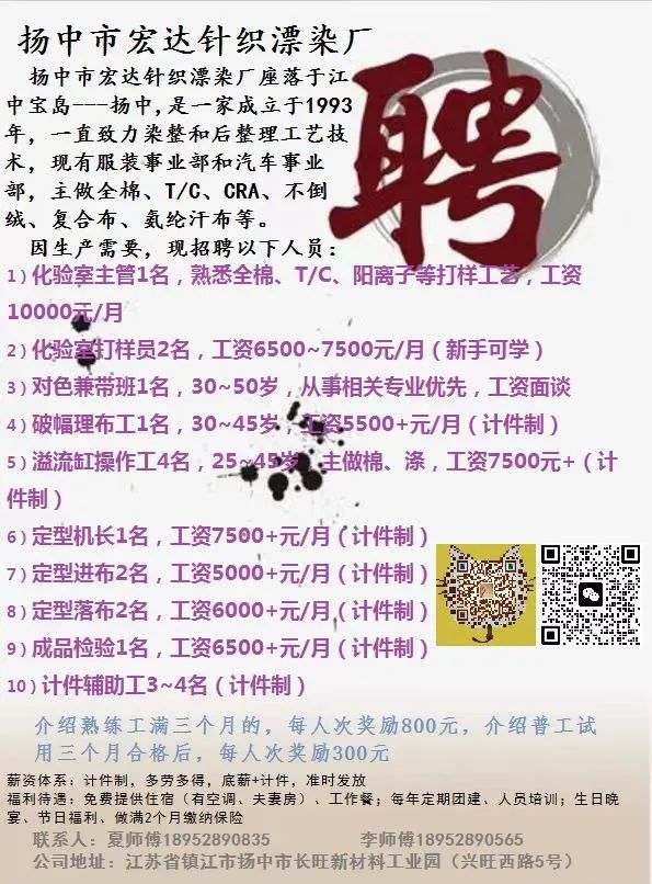 2/17 本公司位于宁波杭州湾新区,因为发展需要特招聘技术好责任心强的电工带机修和 机修若干名 设备亚矶缸 巴苏尼染缸和仁信定型机为主 染色对样员 染色车间领班 化验室打样员各一名有意者 交五险一金 包吃住 待遇面谈 联系电话 13968224411