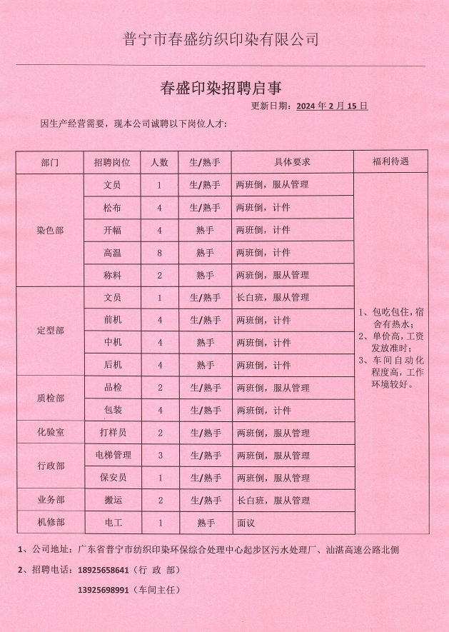 3. 染部文员 2名,18-40岁,熟手优先,底薪+计件5000-6000元