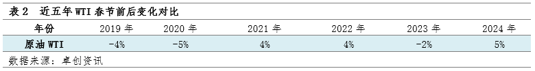 春节假期后,石油化工品上涨概率较大,国际原油上涨带动、库存下降及供需矛盾预期改善需要重点关注。过去五年对比来看,卓创资讯有机化工指数春节前上涨概率在80%,节后上涨概率40%。2024年1月国内化工品市场偏强上行,有机化工指数月均价环比上涨1.43%。临近春节假期,市场逐步进入休假模式,市场运行大体持稳。1月国际原油整体偏强震荡,WTI月均价环比上涨1.73%,供应端扰动持续推动原油价格上行,对化工品价格进而形成支撑,尤其是近油端产品普遍上涨。春节假期国际原油继续上涨,WTI涨幅达到5%,对节后化工品市场起到一定带动。1月能源化工品库存水平继续下降,叠加节后下游化工品开工负荷预计提升,需求逐渐恢复也将对化工品供需矛盾起到一定缓解。