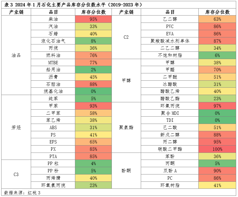 1月能源化工品库存水平继续下降。49个能化产品中库存水平低于历史50%点位的占比55%,较上月增加9个百分点。从1月库存数据变化来看,49个能化产品中库存水平下跌的占比仍处于48.98%,上涨的占比在36.73%,其中甲苯、苯酚、苯乙烯、二甲苯、燃料油库存水平涨幅比较明显。烷基化油、纯苯、甲醇、冰醋酸、石蜡库存水平下跌较多。需求转淡预期下企业生产政策相应调节,以降低库存为主。低库存对市场行情起到一定支撑,节后部分低库存化工品上涨概率将更大一些。
