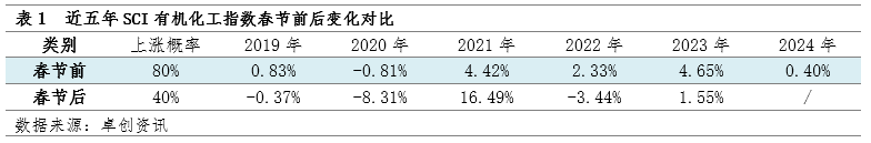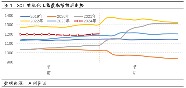 截至2月13日收盘,2024年3月WTI涨0.95报77.87美元/桶,较2月7日收盘上涨5%。中国原油期货春节假期休市。交易员继续权衡与中东紧张局势和能源需求前景相关的原油供需风险,欧美原油期货上涨,WTI连续第七个交易日上涨。从历年春节假期有机化工指数变化来看,化工品市场受供需主导偏强,原油涨跌会从成本端和市场气氛起到一定影响,因此今年春节原油上涨5%对化工品提振效应预期将在节后逐渐兑现。