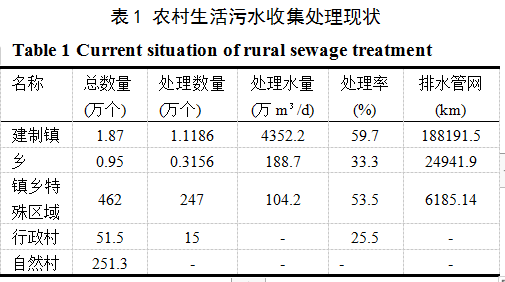 根据《中国城乡建设统计年鉴》(2019),我国约有1.87万个建制镇,0.95万个乡,镇乡特殊区域462个,51.5万个行政村,251.3万个自然村,户籍人口数9.67亿。由表1可以看到,农村污水处理率整体较低,远低于96.8%的城市污水处理率。