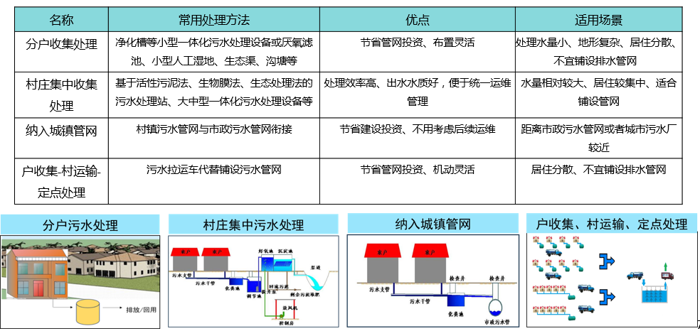 收集处理模式主要有分户收集处理、村庄集中收集处理、纳入城镇管网、以及户收集、村运输、定点处理等模式,每种模式的常用处理方法、优点及适用场景见表4。