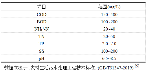 农村生活污水主要来源于粪尿、盥洗、淋浴、杂用等日常生活中产生的污水,水质指标范围参考表2所示。其中粪尿冲厕等污水中含有的有机污染物和氮磷等营养盐浓度较高,通常称为黑水,其他称为灰水。