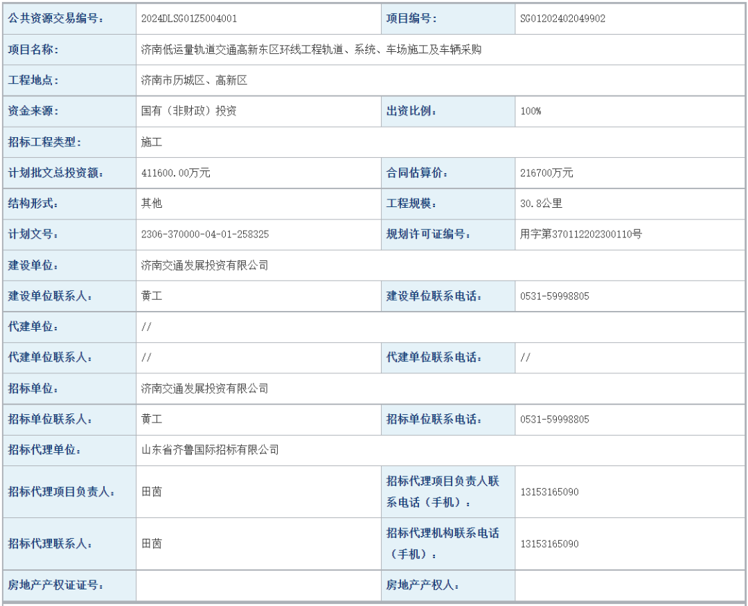 | 1标段 | 30.8公里 | 济南低运量轨道交通高新东区环线工程轨道、系统、车场施工及车辆采购 | 单体1:济南低运量轨道交通高新东区环线工程轨道、系统、车场施工及车辆采购; |