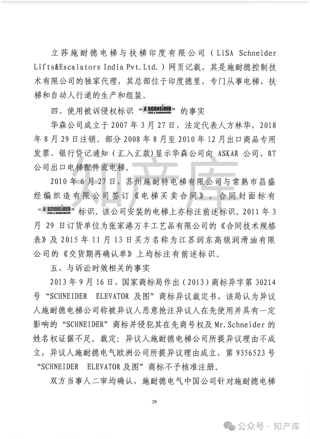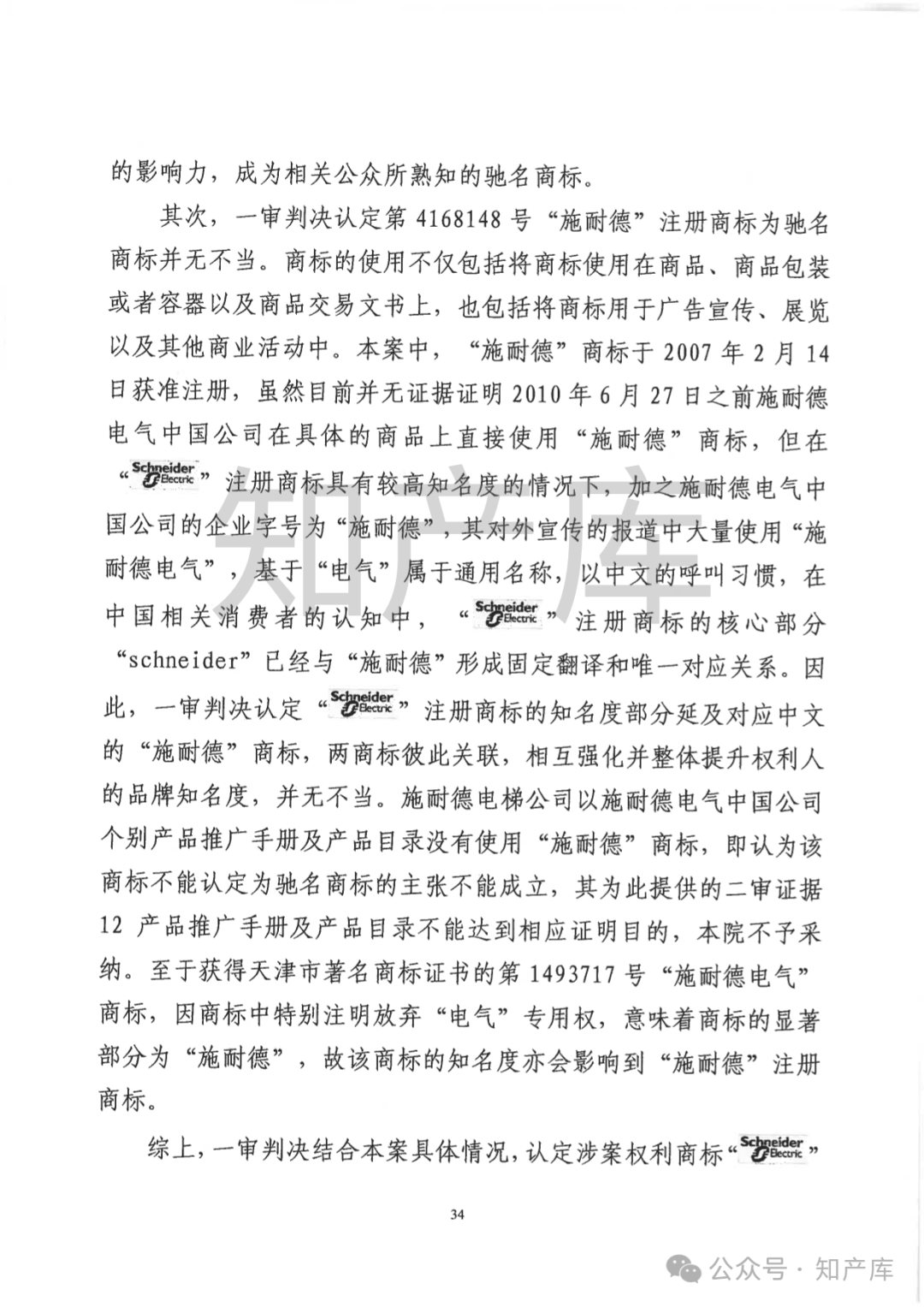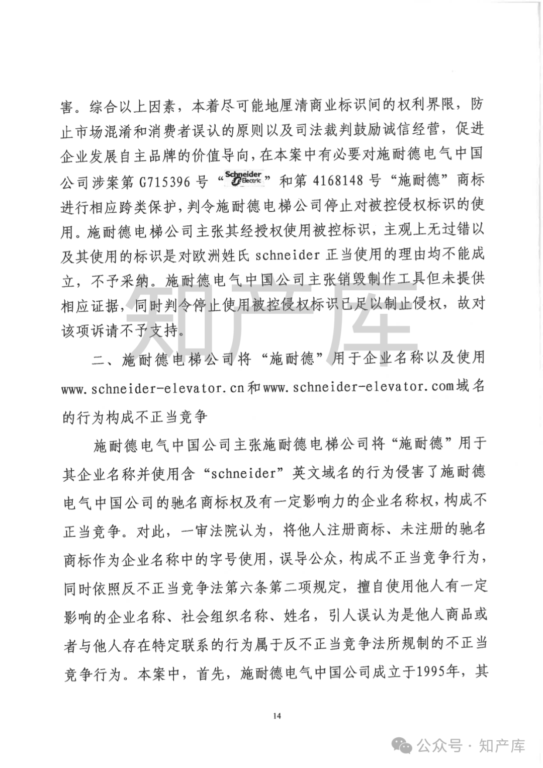 一审法院认定原告第9类“施耐德”构成驰名商标,被告施耐德电梯公司构成商标侵权,同时被告将“施耐德” 用于企业名称以及使用www. schneider-elevator.cn和www. schneider-elevator. com域名的行为构成不正当竞争。