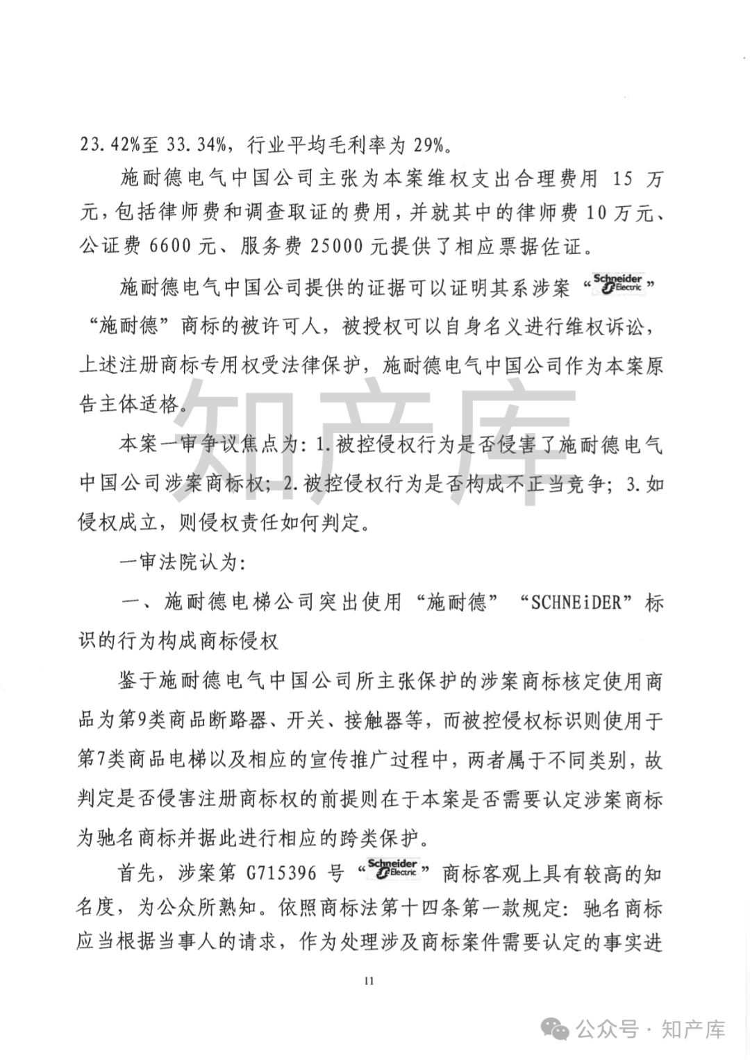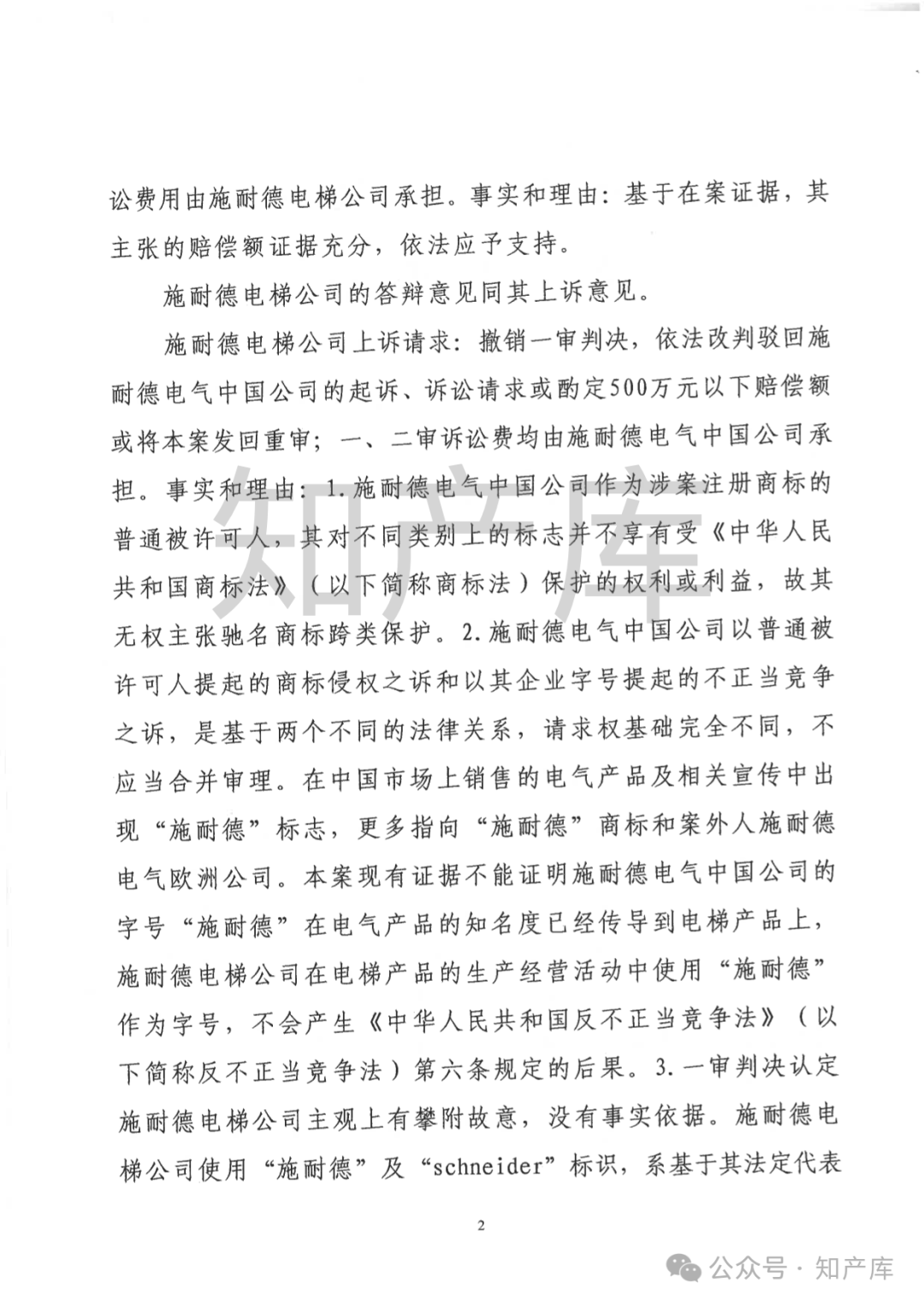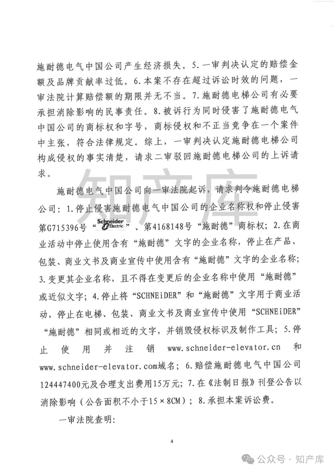 施耐德电气一审起诉认为,第9类“断路器、开关”等商品上的“施耐德”构成驰名,施耐德电梯在第7类电梯商品上构成商标侵权,企业字号及域名构成不正当竞争,索赔124447400元及合理支出费用15万元等。