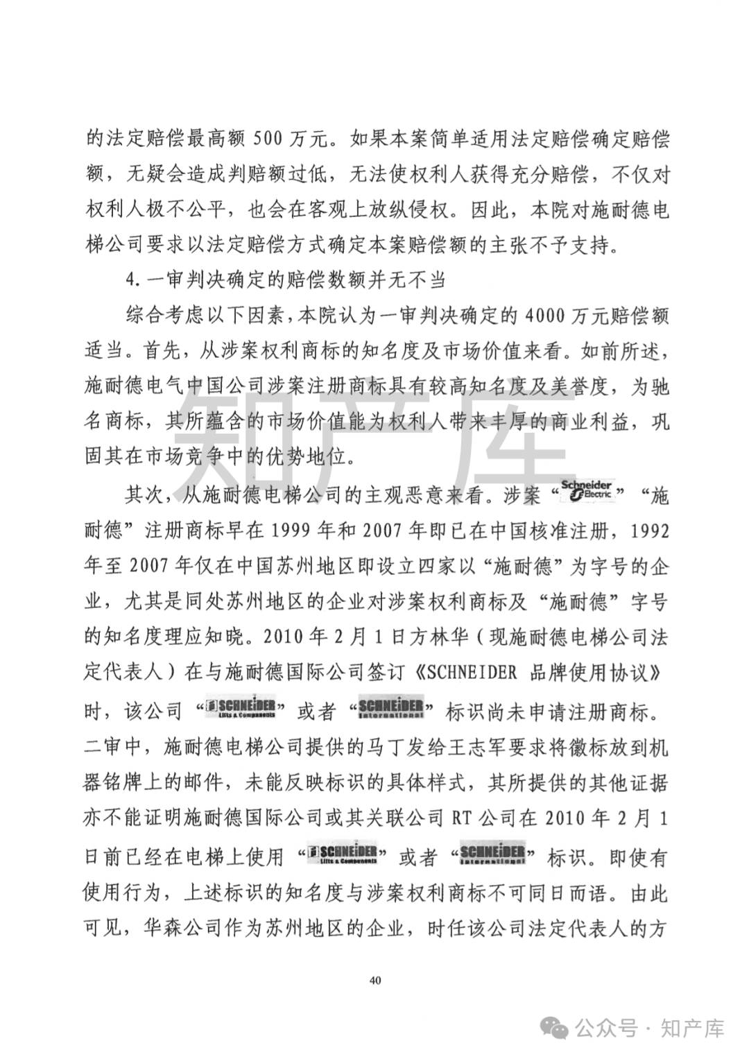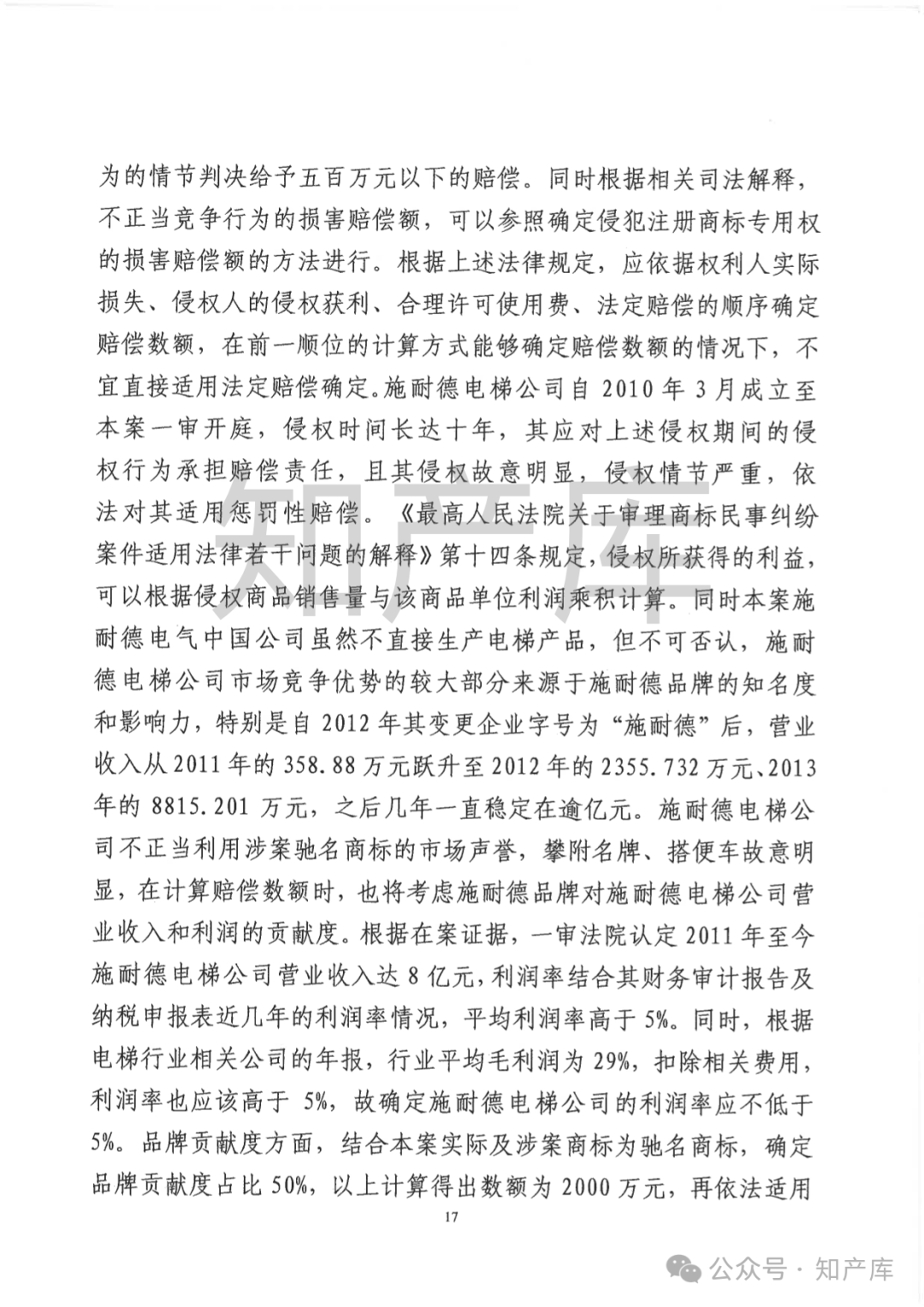 一审法院认定2011 年至今施耐德电梯公司营业收入达8亿元......根据电梯行业相关公司的年报,行业平均毛利润为29%,扣除相关费用,利润率也应该高于5%,故确定施耐德电梯公司的利润率应不低于 5%。品牌贡献度方面,结合本案实际及涉案商标为驰名商标,确定品牌贡献度占比50%,以上计算得出数额为2000万元,再依法适用一倍的惩罚性赔偿,最终确定施耐德电梯公司在本案中应承担的赔偿数额为4000万元。