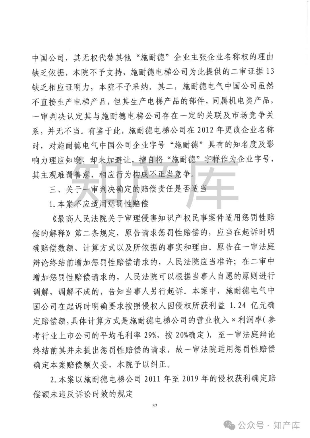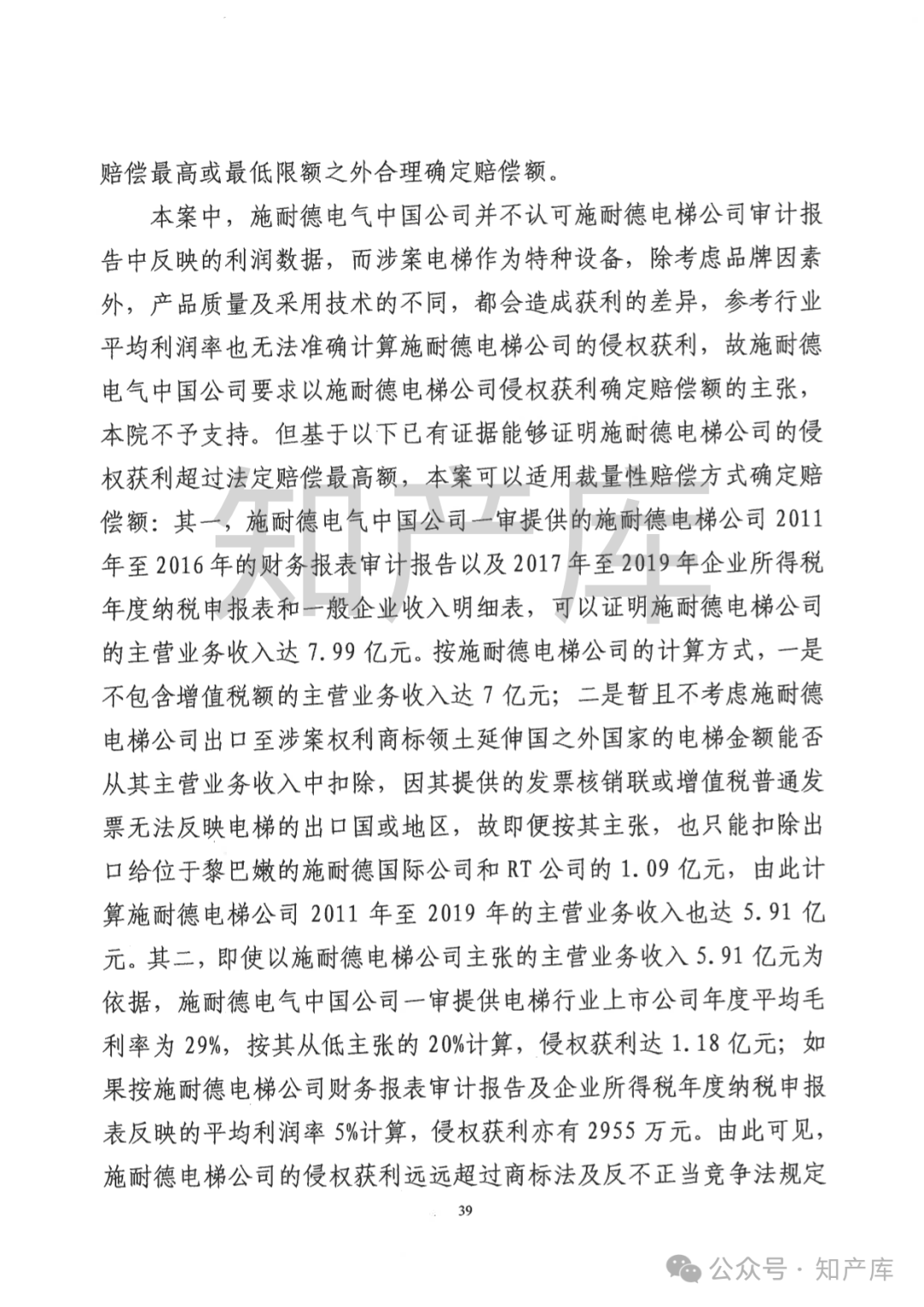 二审法院认为......基于施耐德电梯公司属于以侵害涉案权利商标及 “施耐德” 字号为业的企业,在确定侵权获利时更应参考毛利率,而不是营业利润率......电梯行业上市公司年度平均毛利率为29%,按其从低主张的20%计算,侵权获利达1.18 亿元;如果按施耐德电梯公司财务报表审计报告及企业所得税年度纳税申报表反映的平均利润率5%计算,侵权获利亦有2955 万元等。