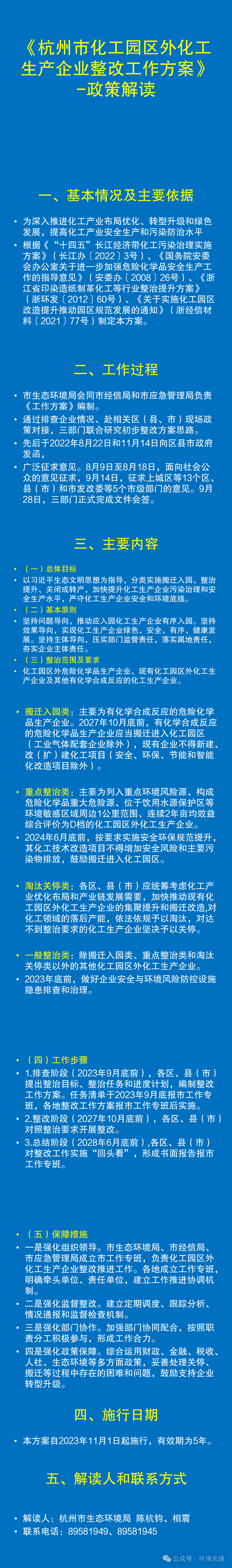 为深入推进化工产业布局优化、转型升级和绿色发展,提高化工产业安全生产和污染防治水平,根据《“十四五”长江经济带化工污染治理实施方案》(长江办〔2022〕3号)、《国务院安委会办公室关于进一步加 强危险化学品安全生产工作的指导意见》(安委办〔2008〕26号)、《浙江省印染造纸制革化工等行业整治提升方案》(浙环发〔2012〕60号)、《关于实施化工园区改造提升推动园区规范发展的通知》(浙经信材〔2021〕77号)等文件精神,有效防范化解我市化工园区外化工生产企业环境风险和安全隐患,推动应入园化工生产企业入园,杭州市生态环境局、杭州市经济和信息化局、杭州市应急管理局制定发布《杭州市化工园区外化工生产企业整改工作方案》。