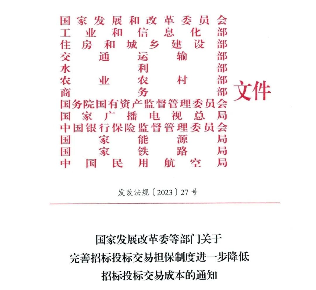 近日,国家发展改革委、工业和信息化部、住房城乡建设部、交通运输部、水利部等13部门联合印发《关于完善招标投标交易担保制度进一步降低招标投标交易成本的通知》,要求加快推动招标投标交易担保制度改革,降低招标投标市场主体特别是中小微企业交易成本,保障各方主体合法权益,优化招标投标领域营商环境。