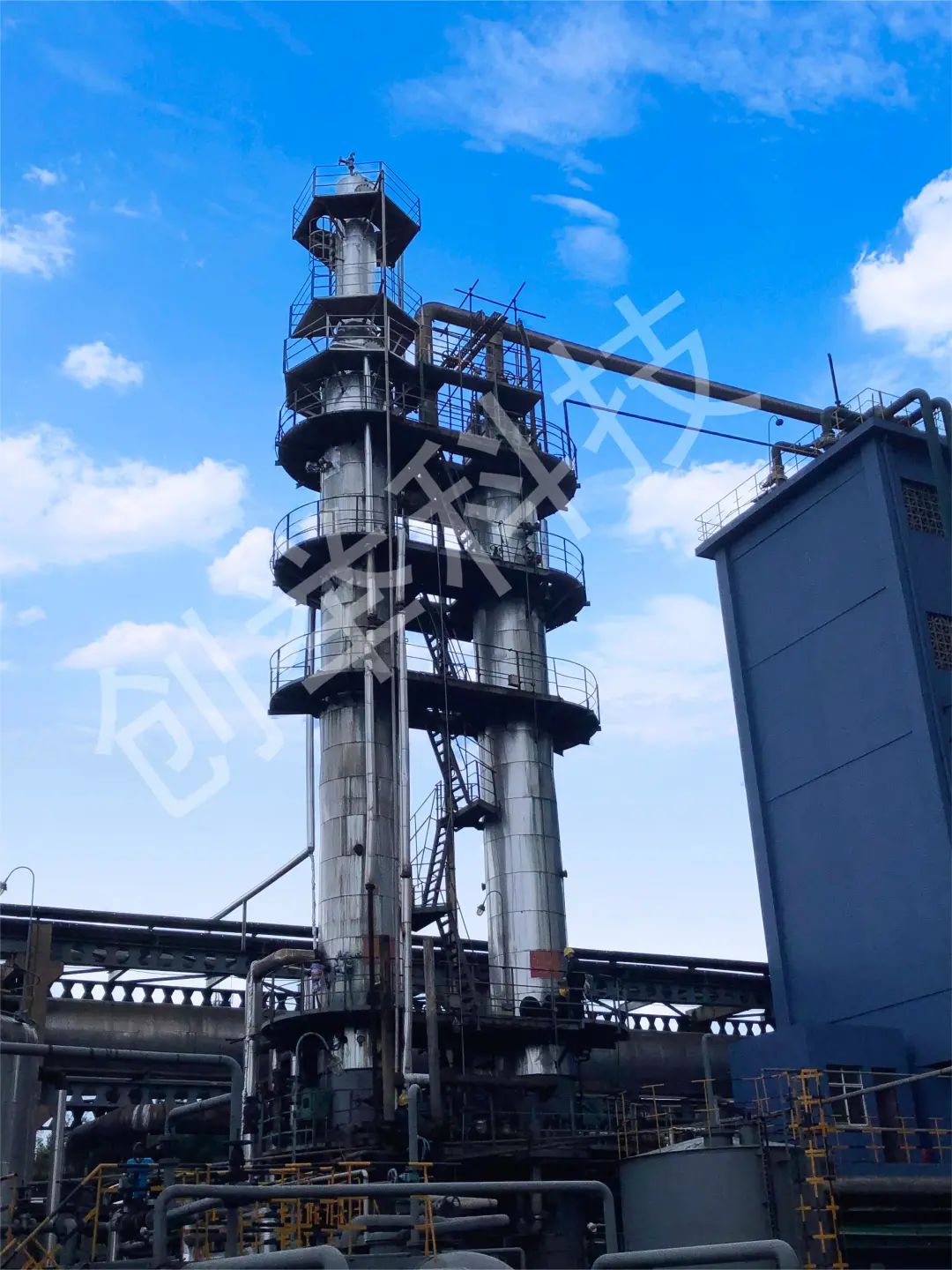 该项目原有蒸氨塔使用已有十余年,传统的设计蒸氨塔效率较低,产出的氨水浓度仅有2-3%,氨水用于脱硫液补氨效果不佳。现对原有蒸氨塔进行升级改造,采用创举科技“剩余氨水制备20%高浓度氨水专利工艺包技术”及“CJVP系列高效抗堵塔盘”,对产出氨水提浓。