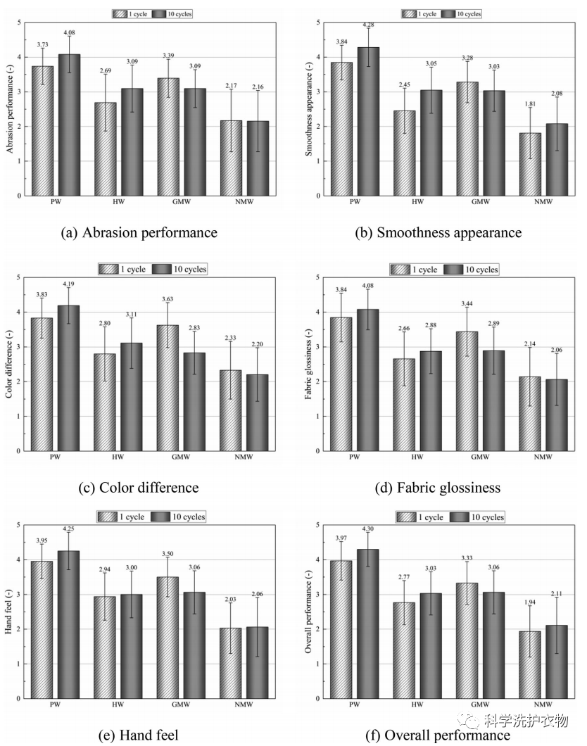 图3 四种不同方法洗涤1次和10次洗涤后样品的感官评价结果