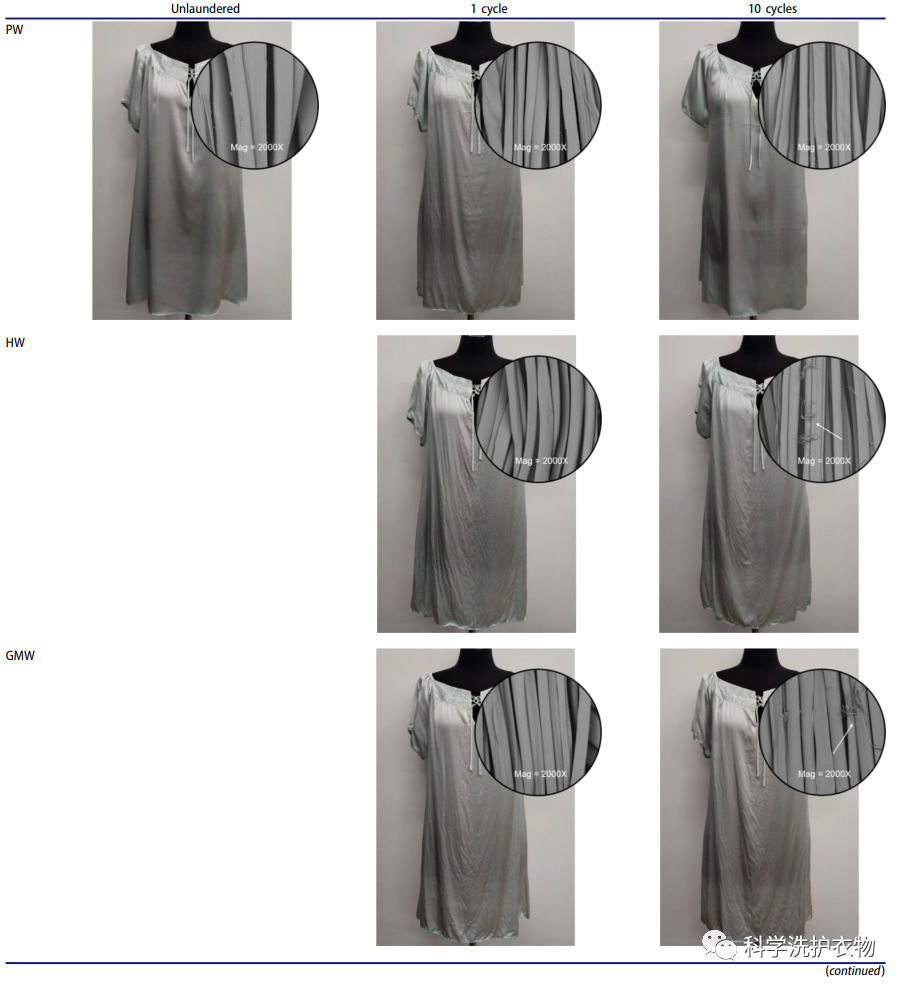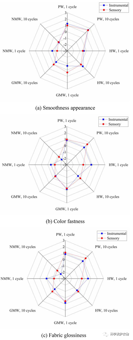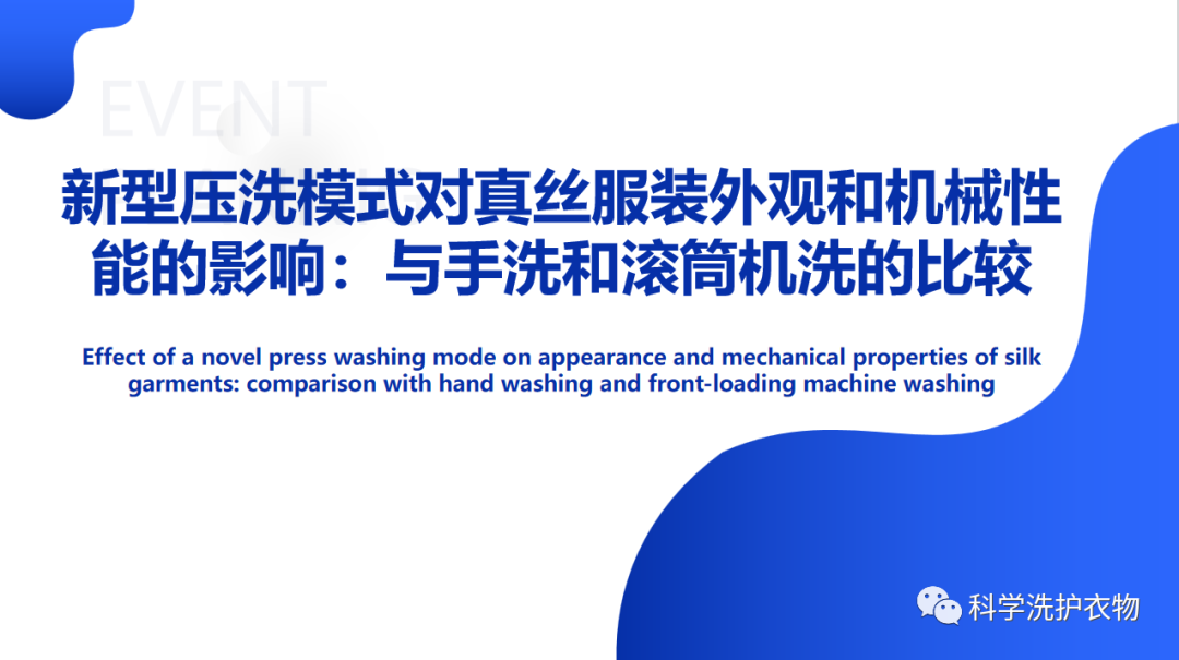真丝服装以其独特的光泽、柔软和魅力一直在时尚市场中占据着重要地位。然而,此类织物在日常护理中存在困难并且在洗涤后往往视觉感受变差。为此,松下在2021年推出了一种以上下轻压、真空脱水为特征的新型洗涤模式,以解决普通家庭洗涤方式对真丝服装的机械损伤问题。本研究通过与手洗、轻柔机洗和正常机洗进行比较,研究了压洗模式对真丝服装在常见家庭洗涤场景下外观和机械性能的影响。实验结果表明,在外观指标和弹性恢复方面,压洗表现最佳,尤其是在重复洗涤的情况下,由于在洗涤过程中纤维损伤和表面降解最少。同时,考虑到消费者的个人感受,对洗涤后的样品进行感官评价,在一定程度上进一步验证了仪器测试结果。本研究获得的结果可以为后续研究和应用提供科学的护理指导和优化思路。