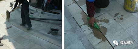 4. 清缝。待填缝剂稍收浆后,用海绵擦净,清理其他铺装面污染,用海绵擦拭(海绵略带水份,使水自然渗入缝中);