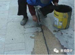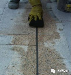 4、 勾缝:石材铺装留缝需要勾缝处理,勾缝原则上要求采用专业勾缝剂勾缝,以勾缝区域不产生泛碱为原则。