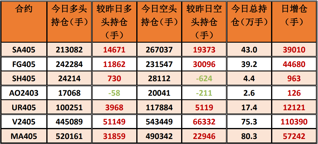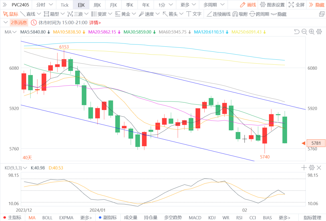 6.PVC2405:预计将偏弱震荡。节后PVC部分企业开工逐步恢复,供应端产量略有提升。需求端,下游复工多在2月底开启,目前需求仍处低位。液氯价格跌落明显,成本有下降趋势。图形上,今日价格明显下跌,临近前期5750支撑位,K线整体依然在偏弱趋势内。预计短期偏弱运行,建议谨慎试空,暂无做多条件。