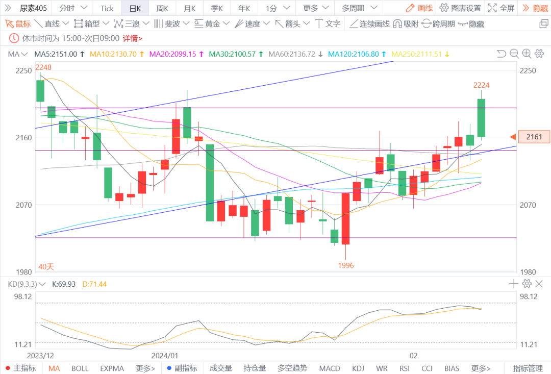 5.尿素405:预计将偏强震荡。近期国内尿素现货价格大幅上涨,新单成交氛围较好,工厂待发订单充足。尿素日产逐步回升,供应较为充足。春节期间物流发运不畅,尿素企业库存环比累积。需求端,农业需求逐步启动,终端补货积极性增加。图形上,今日价格高开低走,总体延续上行态势,5日10日均线支撑有力,预计短期偏强震荡。建议2140-2150附近逢低做多,压力位2230附近,或关注5-9合约正套机会。