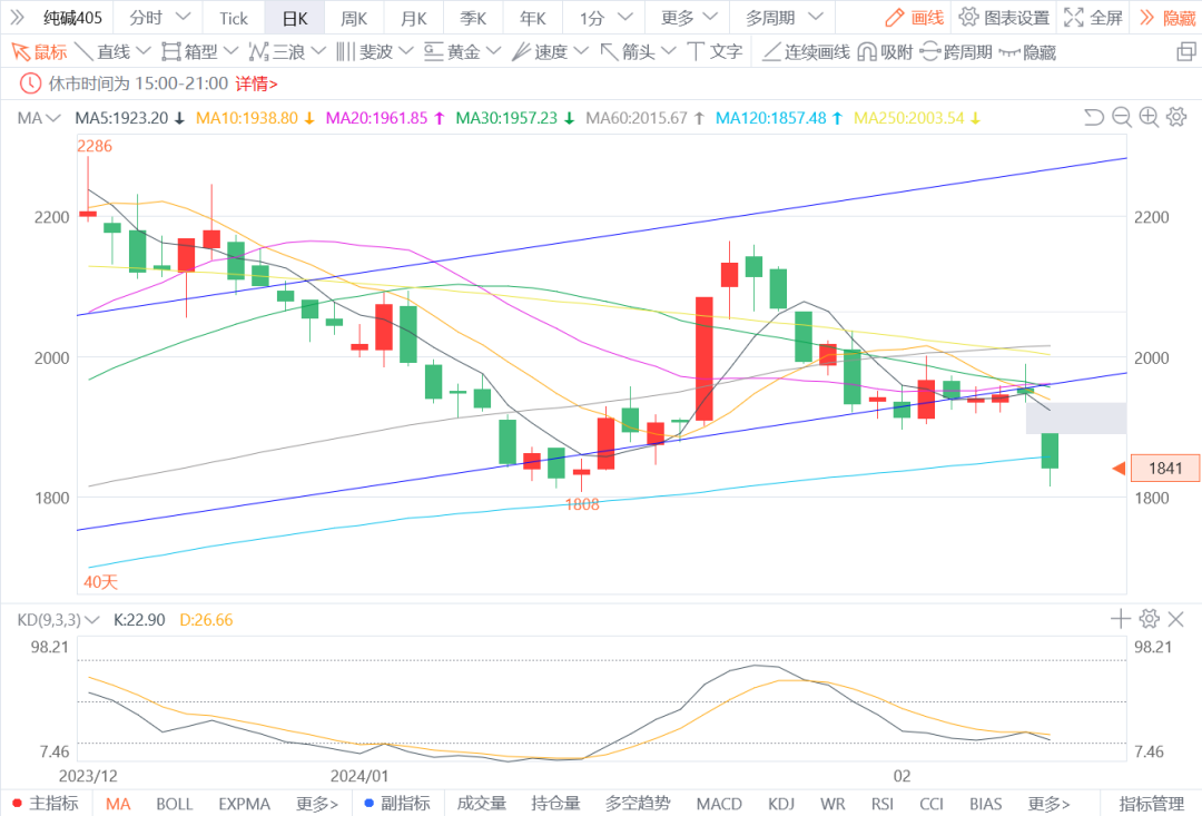 1.纯碱405:预计将偏弱震荡。假期期间国内纯碱现货价格保持平稳,节后市场询盘陆续恢复,供应高位且部分碱厂有提产预期。节日期间物流运输受阻,企业库存增加。需求端补库意愿有限,价格上行驱动不足。图形方面,今日价格低开低走,再次触及前低点1800附近。若价格持续下行则可能构成双底反弹结构,建议谨慎看空,可在1910-1800区间操作。