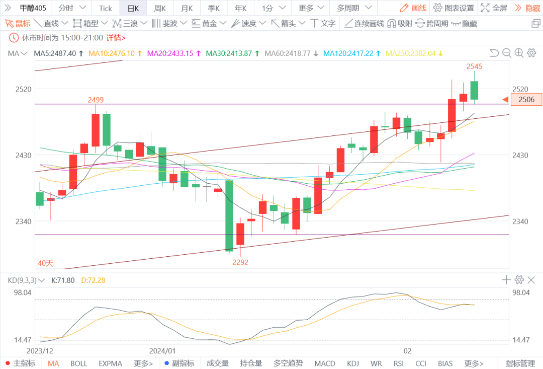 7.甲醇405: 预计将震荡整理。甲醇企业节日期间以消耗现有库存为主,企业将存少量补库需求。近期,产地化工煤价格呈现小幅上涨走势但对甲醇成本端影响不大。甲醇库存量和到港量均有增加。图形上,今日价格高开回落未能触及前高2551,下方通道线支撑位明显,震荡区间2550-2490。建议短期观望,中长期谨慎看多。