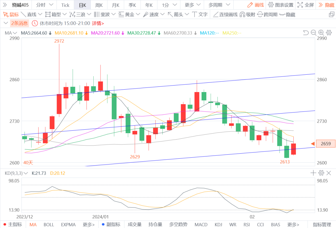 3.烧碱405:预计将震荡整理。春假期间烧碱现货价格稳定。云南铝厂减产结束,下游氧化铝开工持稳,其刚性需求对烧碱价格有一定支撑。3月生产端有部分企业进入检修,预计供应量将有下滑。图形上,今日价格回踩通道线支撑位后修复性上涨,KD底部弱势交叉。预计烧碱中长期维持震荡态势,建议观望。