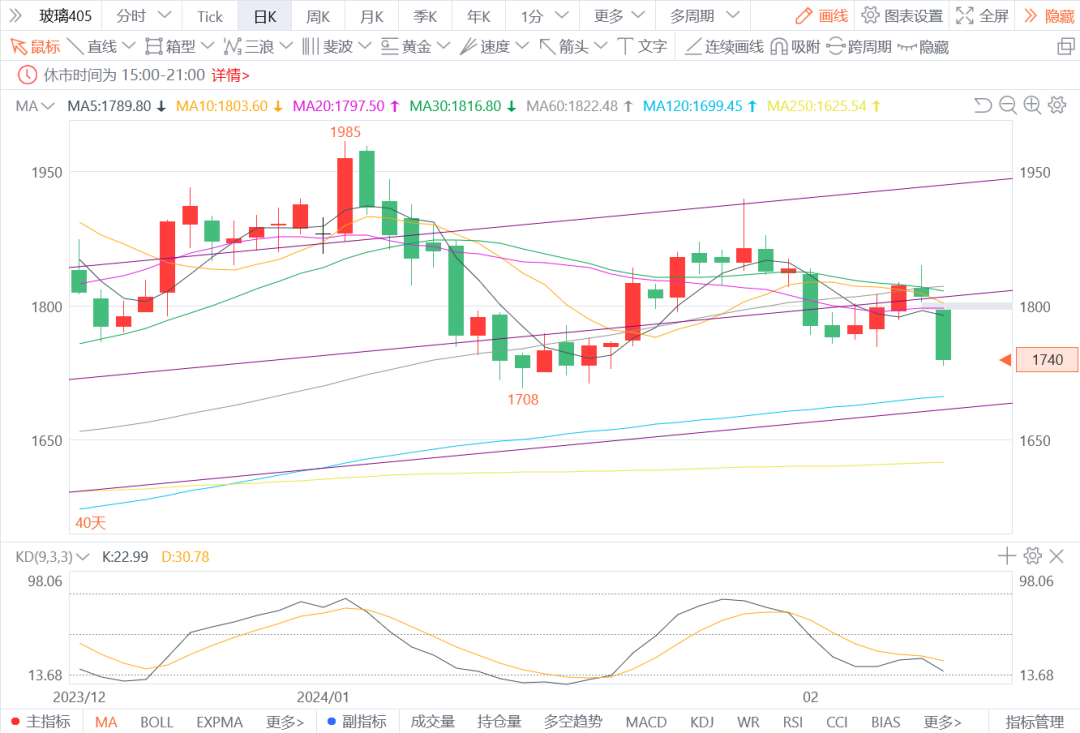 2.玻璃405:预计将偏弱震荡。今日现货成交均价1869元/吨,变化不大。春节期间玻璃日熔量接近历史高位水平,玻璃厂库存有较大累幅。截止到2月18日,全国浮法玻璃样本企业总库存创7个月新高,环比增加38.99%。下游地产即将开工,需求预期向好。图形上,今日价格低开再度重返1795弱势调整格局内,短期震荡区间大概为1790-1708。建议观望或区间操作。