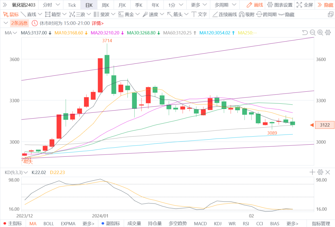 4.氧化铝2403:预计将震荡整理。氧化铝供需短期维稳为主,环保政策叠加铝土矿紧缺影响暂未消除,氧化铝厂提产受限,下游云南电解铝暂难有复产。图形上,K线仍在下降趋势内徘徊,均线分散,KD偏弱,价格重心略有下移。短期偏空对待,建议观望为主。