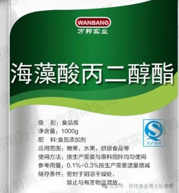 海藻酸丙二醇酯:抗老化、改善改良面米制品蛋白质的基琏、改善短中期抗冻面粉、保湿、保鲜、锁水、增稠、增筋、螯合等