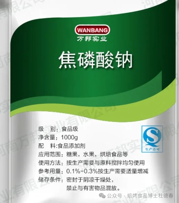 焦磷酸钠:增稠、乳化、保湿、保鲜、保水、抗冻剂、增筋、增白、抗老化、螯合等。