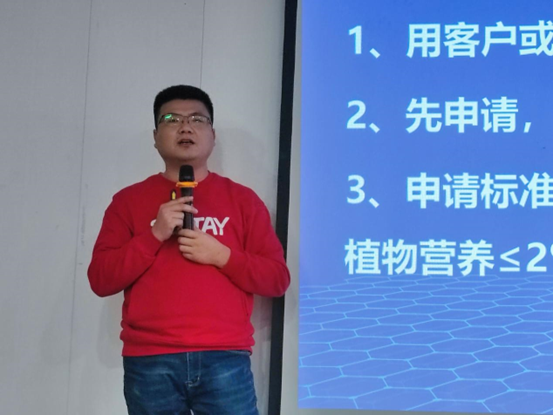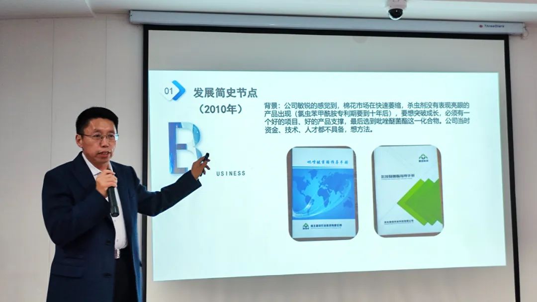 深泰化工副总经理张文侃讲解了深泰化工的发展史及公司文化,从2004普田农业成立(即深泰化工的前身),到2008年12月5日深泰化工的成立,产品从单一的谷丰鸟品牌到沃若品牌的发展,从制剂到原药的发展。公司企业文化的落地,深泰化工是一个以人为本的企业,在职员工都能享受到免费的工作餐以及节假日福利,为员工的生活提供了保障。