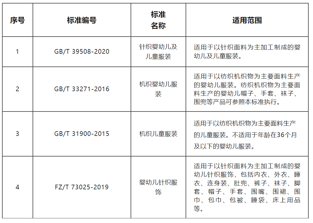 目前现行有效的婴幼儿及儿童服装产品标准主要有以下这些: