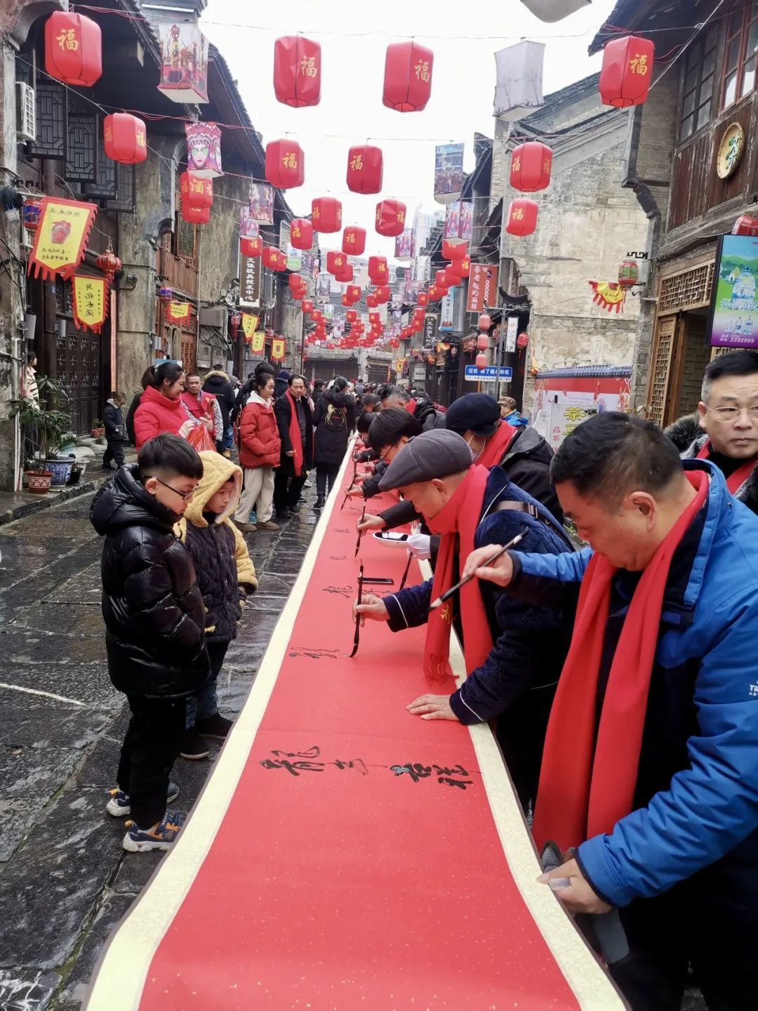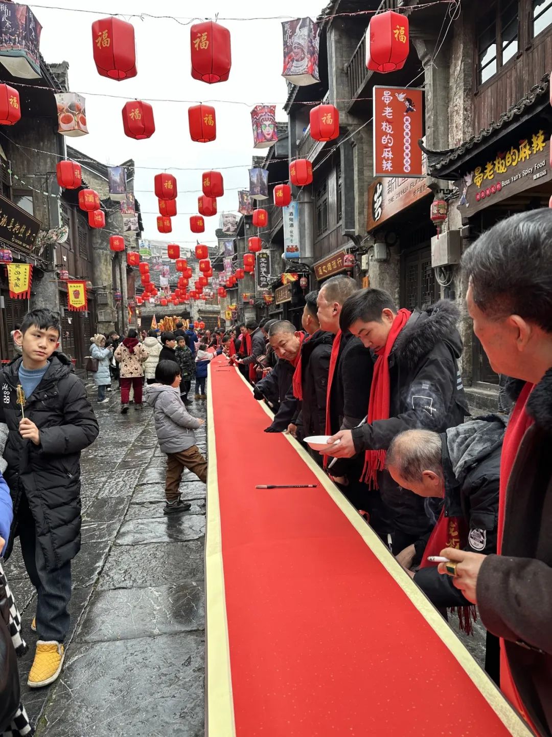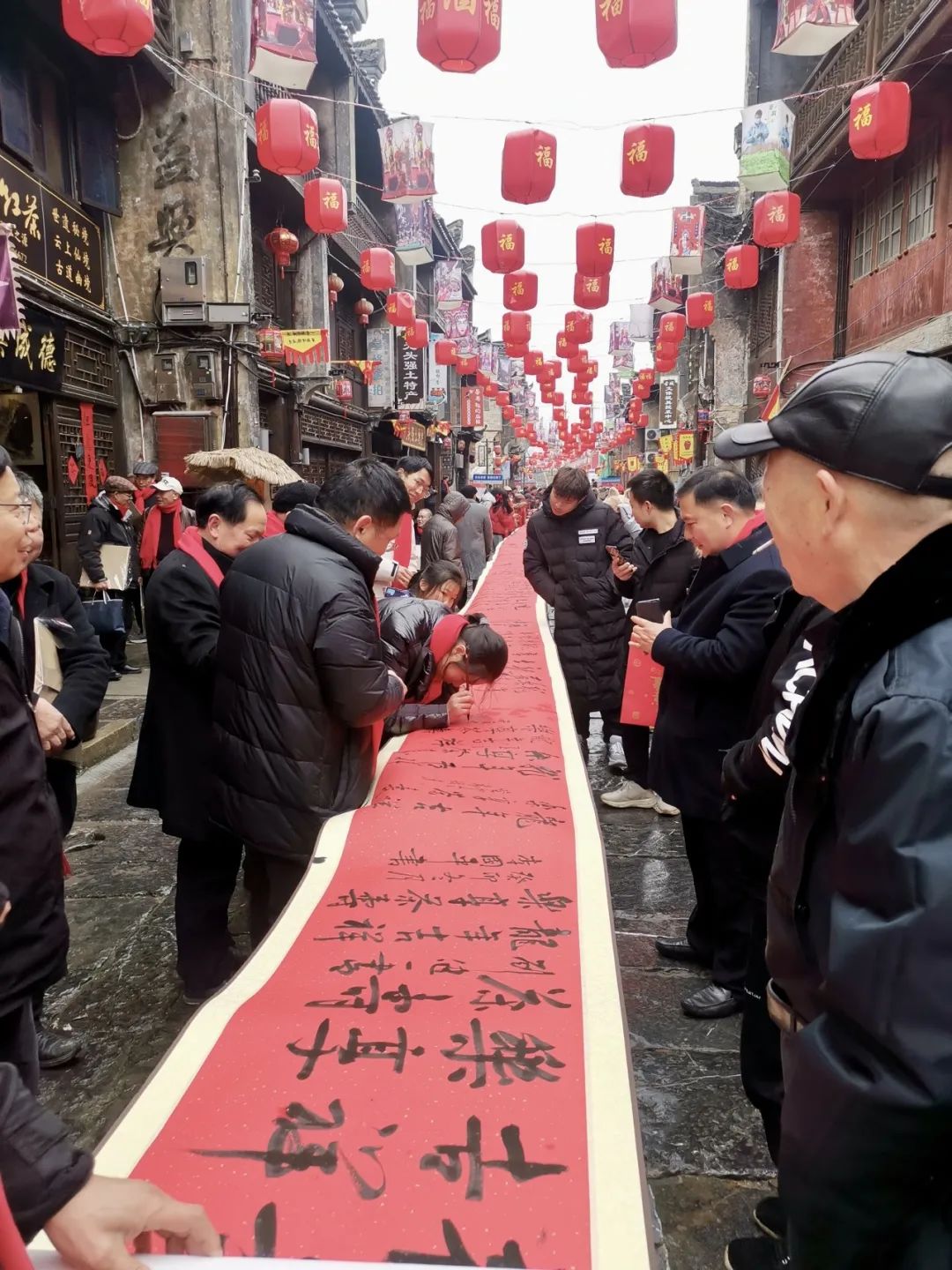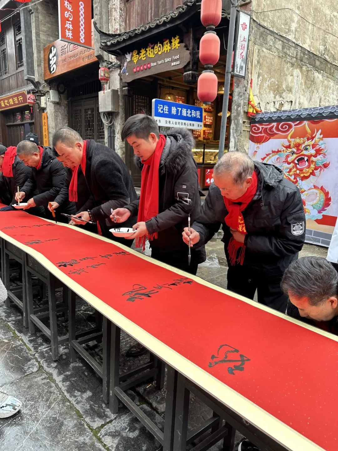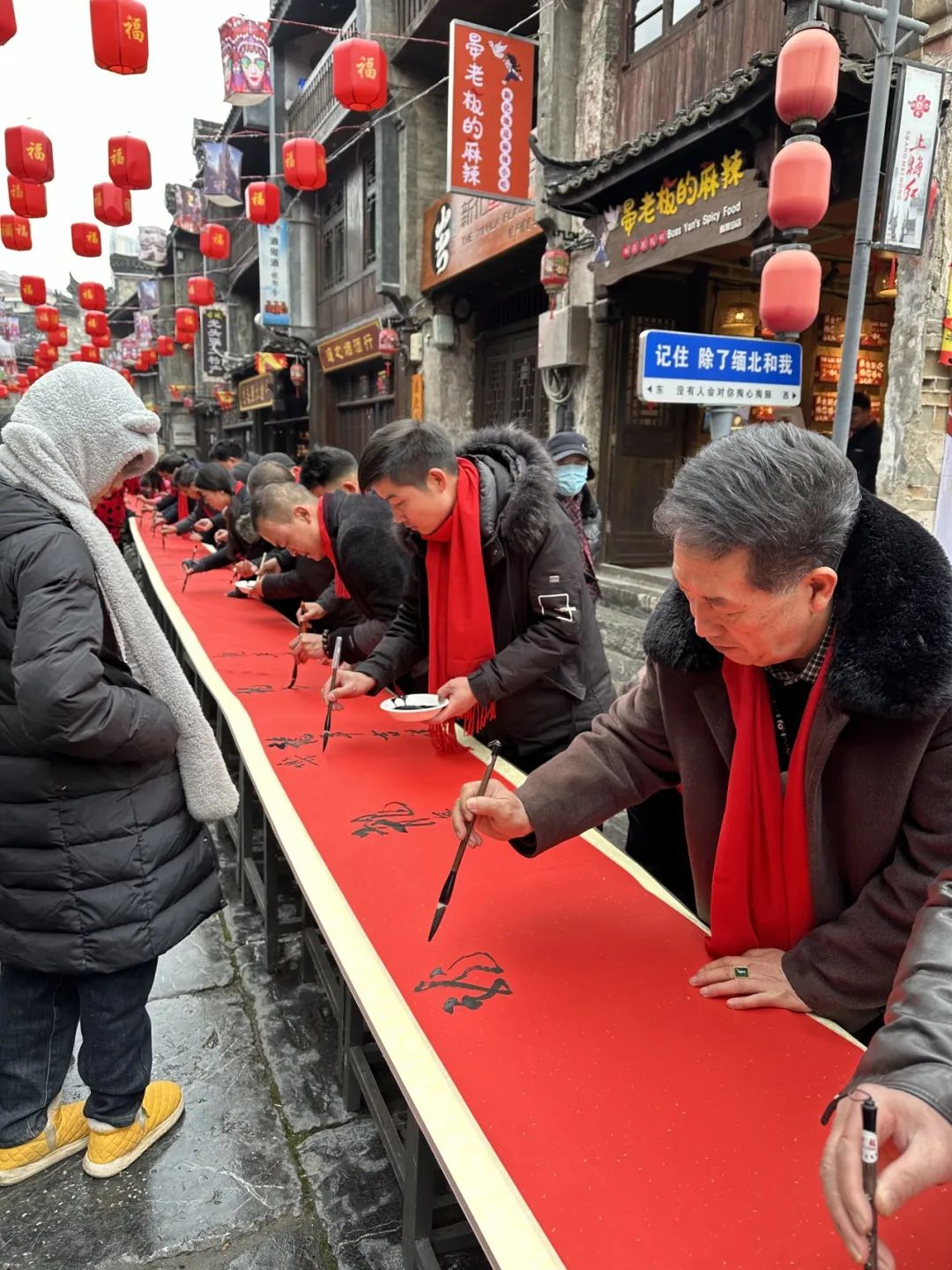 春节前夕,江苏大学化学化工学院化工2301班车雄韬同学在湖南省新化县上梅古城向东街用镜头记录了为期三天的“烟火向东街,新化蛮有味”年货节活动。作为书法爱好者,车雄韬同学参与到“龙年吉祥 乐享茶寿”百米书法长卷文化创作中。整条街处处张灯结彩,祝福蕴藏在一笔一画中,年味也在欢声笑语中逐渐浓郁起来。