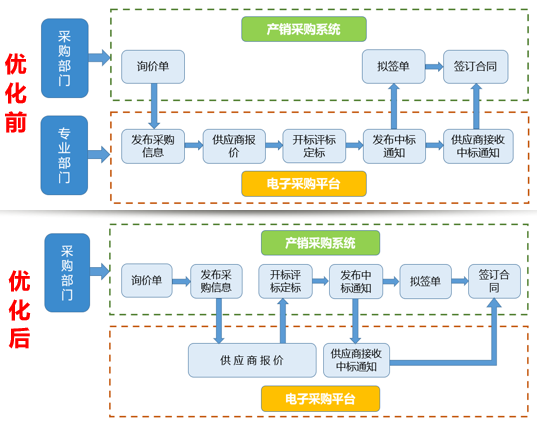 一是整合产销系统和电子采购平台业务流程。优化前,一条业务链在两个系统(产销系统和电子采购平台)之间来回切换,需要跨专业、跨系统才能完成。优化后:各采购方式流程统一,询价单和拟签单的创建和审批环节,以及评审全流程由采购员在产销系统操作完成。提升业务规范性、流畅性和可操作性。