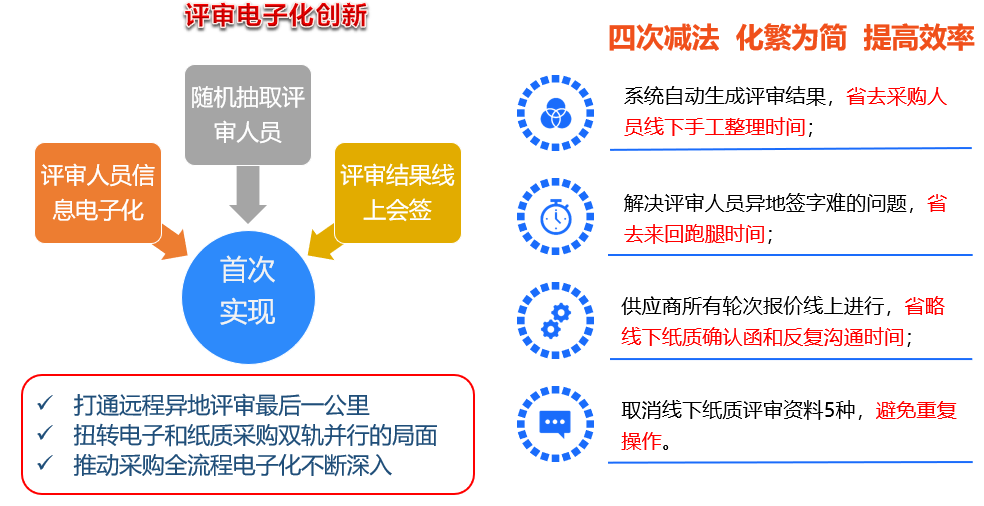 通过远程异地评审系统和电子化采购的全覆盖进一步降低评审成本、交易成本、采购以及合同文本和差旅费用等,以当前平台应用规模计算,预计每年为企业和供应商至少节约成本5000万元以上。