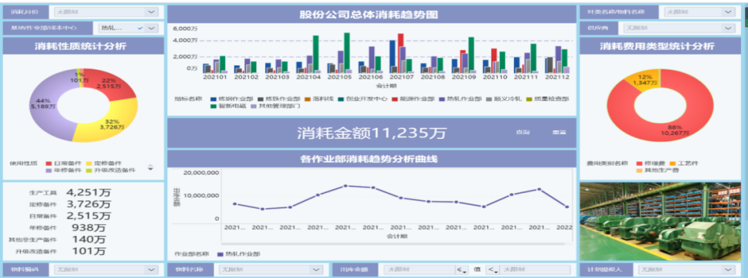 首钢股份充分利用电子化、信息化手段,在大数据可视化应用和分析评价方面继续探索,为业务流程优化、采购提效、管理提升等方面提供数据支撑。备件专业借助FineBI数据分析平台,在原评价分析体系基础上完善结构,在数据关联分析、多层级分析、可视化展现等方面做了大量尝试,完成“备件消耗分析”、“备件合同时效分析”、“备件物料主数据分析”等多个模块的开发,供日常分析使用。促进基层用户养成用数据说话的管理思维,同时大幅提高了用户统计分析效率,促进了管理提升。