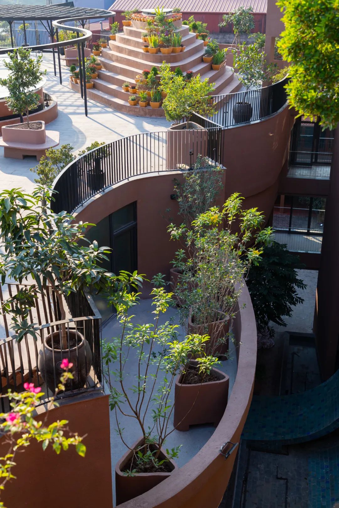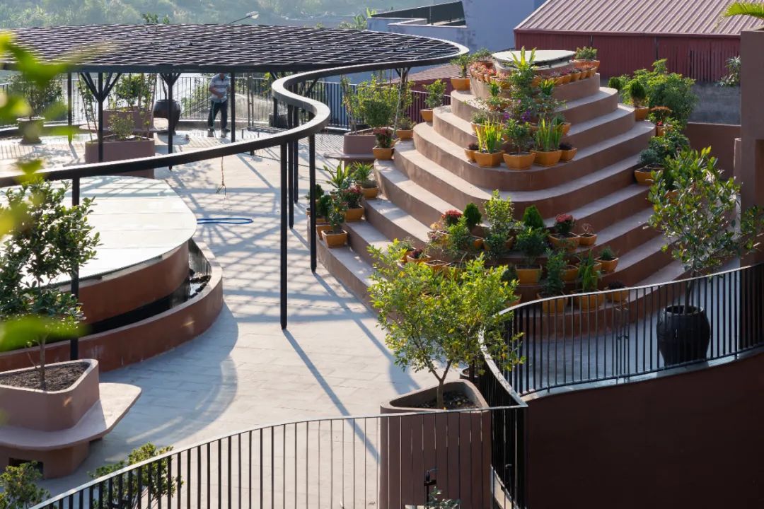 为了呼应村庄的乡村魅力,社区中心主要展示了粗陶的红褐色调,采用了与工艺村同义的材料,如巴亭砖和瓦片。这种选择不仅增加了建筑的审美吸引力,还强化了其作为当地工艺的标志。