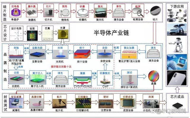 是不是已经被吓到了?注意,这还是一张简图,实际上芯片制造分为前道工艺和后道工艺,每一段工艺又分为几十甚至上百道工序,中间只要一个环节走不通,那都是半途而废。最后,为了让大家能看得清楚一些,笔者将上述的图再简化如下所示: