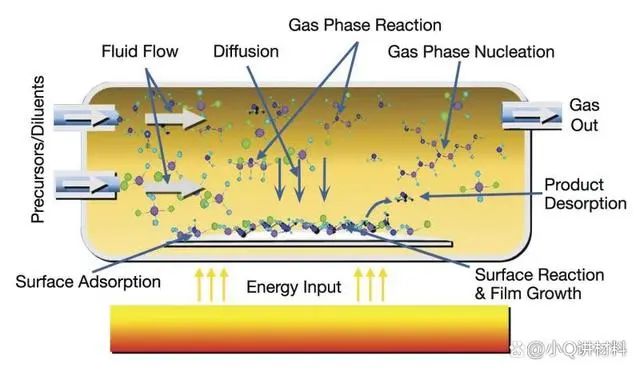 典型的CVD工艺是将晶圆(基底)暴露在一种或多种不同的前驱物下,在基底表面发生化学反应或化学分解来产生所需的沉积薄膜。CVD 的基本流程如图所示: