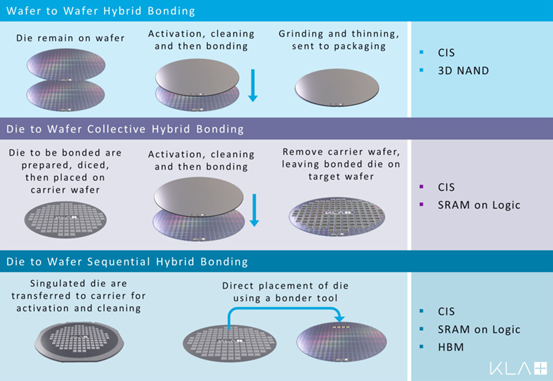 其中,W2W 虽然已经实现量产,但它对于上下芯片的大小限制须为一样大小,否则将有区域浪费;D2W是将切割好的Die用临时键合的方式粘到晶圆上,然后整片地和另一片产品晶圆整片键合再解键,这项技术容易累计误差,且成本高,对Die的厚度变化范围也有较高要求;C2W将切好的Die分别放置晶圆的对应位置上,位置精度虽然提高且厚度变化要求不在严苛,但颗粒控制也是影响它继续普及的问题。