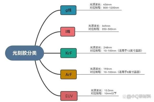 光刻胶就是图中橙色的部分,也有人将其称为光阻剂。光刻胶分为正胶和负胶,正胶经过曝光后会溶解于显影液,负胶则是相反的。按照曝光光源的波长分类,光刻胶分为g线,i线,KrF,ArF以及EUV光刻胶,由左到右,光刻胶对应的曝光波长逐渐变短,先进的EUV光刻胶对应曝光波长只有13.5nm,可用于10nm以下的芯片制程,但目前EUV光刻机只有荷兰ASML能制造。