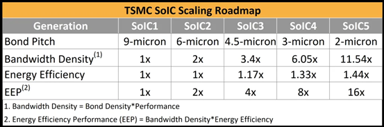 台积电无疑是混合键合的集大成者,其SoIC 封装技术依靠混合键合,在芯片 I/O 上实现了强大的接合间距可扩展性,实现了高密度的芯片到芯片互连,其键合间距从 10 微米以下开始,台积电表示与目前业界最先进的封装解决方案相比,短芯片到芯片连接具有外形尺寸更小、带宽更高、电源完整性和信号完整性更好以及功耗更低的优点。此前,台积电已经展示了其第四代混合键合技术的研究成果,该技术可实现每平方毫米 100,000 个接点数量。