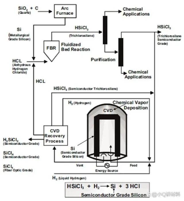 首先,利用焦炭,在1500℃的条件下,将二氧化硅原料还原成金属硅,此时的金属硅纯度仅仅为97%,具有杂质;随后,利用氯化氢(HCl)在300℃的低温下将金属硅变为三氯硅烷,而氯化氢也会将金属硅中的杂质溶解,由于杂质和三氯硅烷蒸汽压较大的差异,此时,杂质的氯化物会受热蒸发,硅的纯度得到进一步提高。