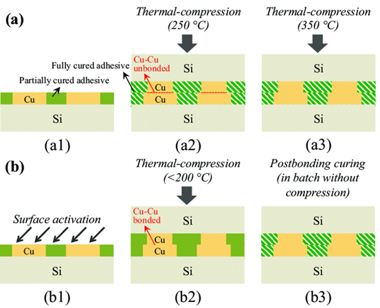 它验证了低温直接键合(Direct Bond Interconnection, DBI)的可行性,首先准备好晶片具有SiO 2(介电材料)与铜(接点金属),此时铜部分将会有点略低于介电材料厚度,利用电浆(Plasma)做表面活化处理,将晶片面对面在室温下进行对位接合,由于凡德瓦力作用已具有一定的接合强度,接着在100℃ 下持温让SiO 2与SiO 2之间进行缩合反应,形成强力共价键提高接合强度 。接着再将温度提高到300℃ 至400℃ 持温,此时由于铜金属的热膨胀系数较SiO 2来的大,铜表面将会碰触在一起,并自然受到一压应力,促使铜接点进行扩散接合。