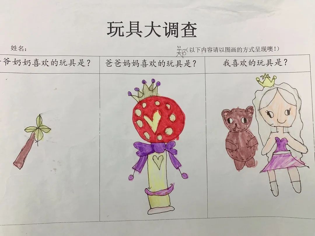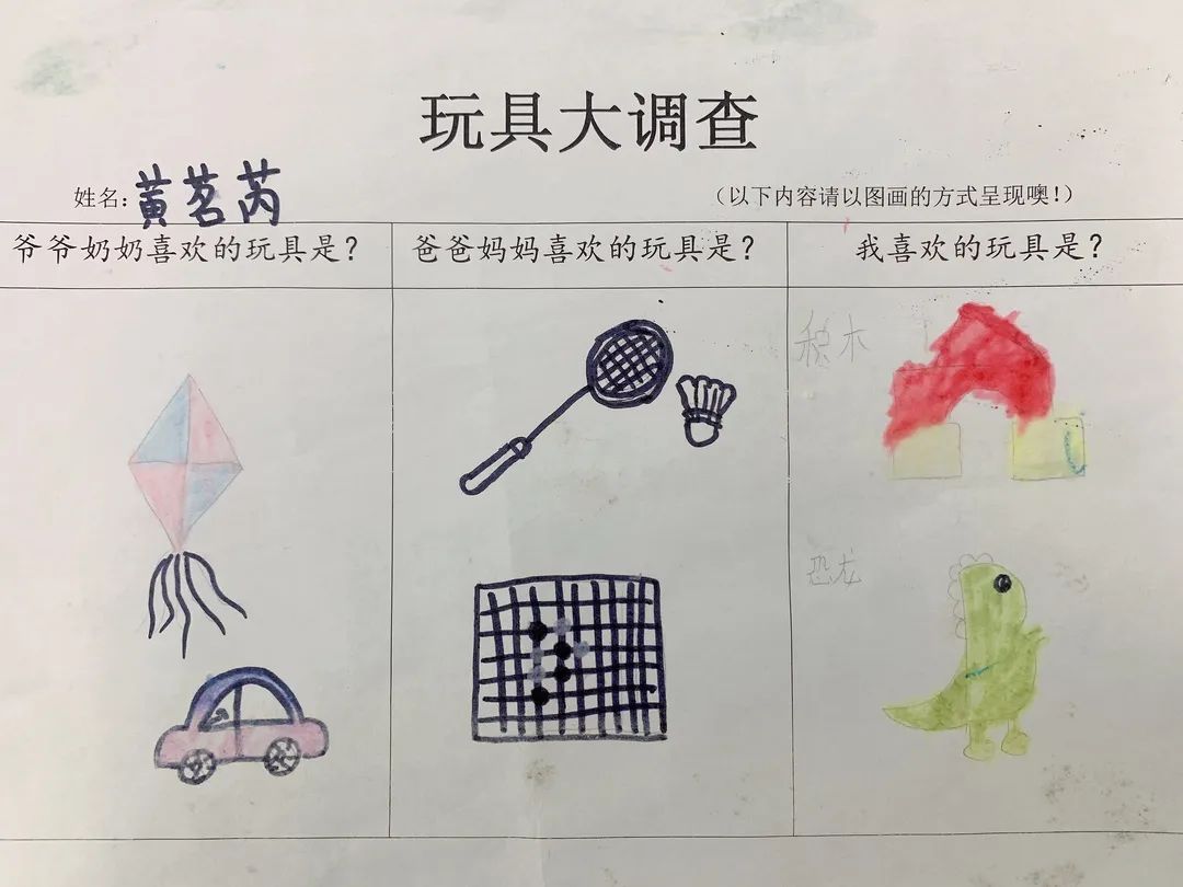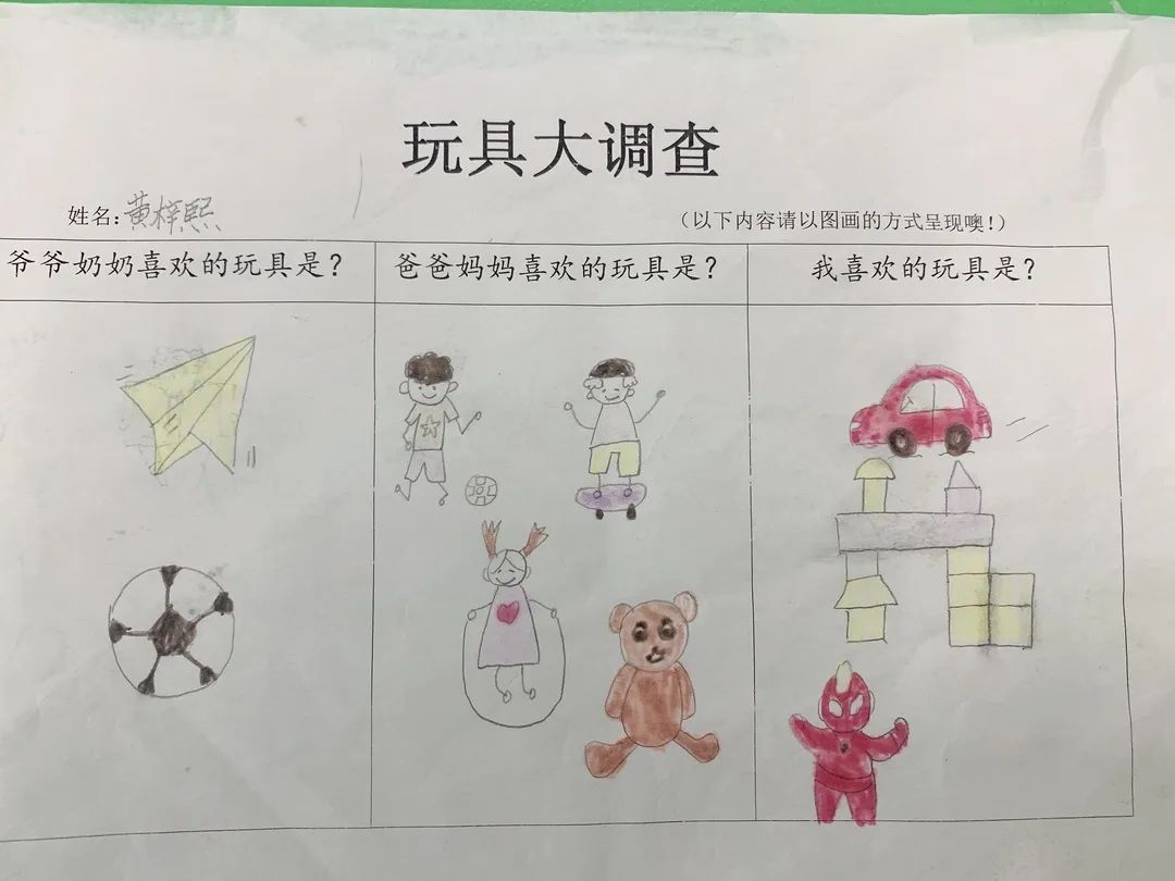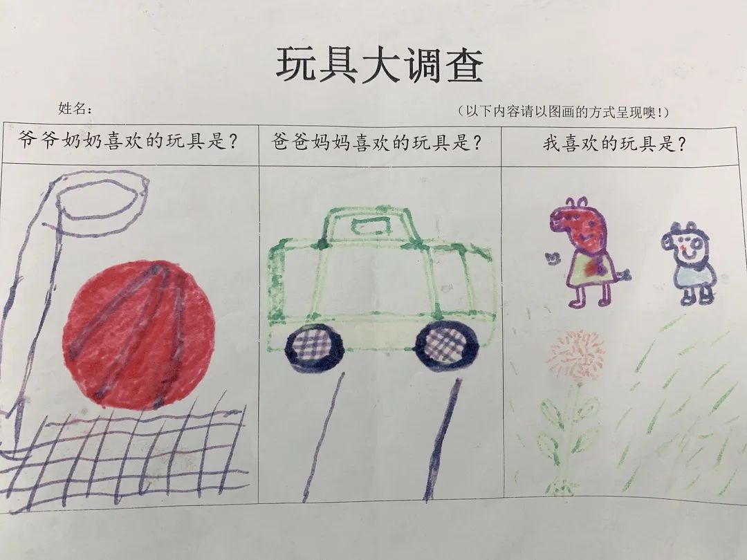 通过和爸爸妈妈一起调查,孩子们认识了各种各样的玩具,也了解了玩具的玩法、材质等。